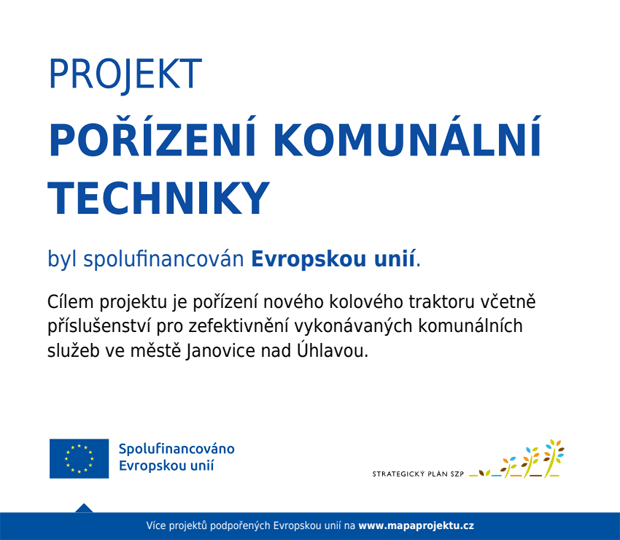 Cílem projektu je pořízení nového kolového traktoru včetně příslušenství pro město Janovice nad Úhlavou. Tento projekt je spolufinancován finančními prostředky z EU.